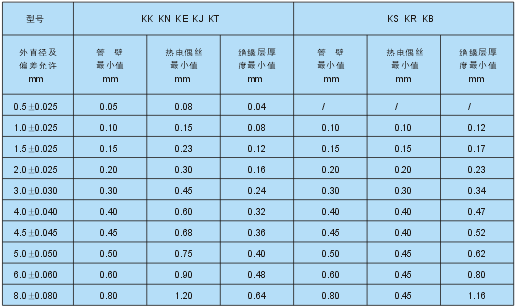 注:對于多芯或單芯鎧裝熱電偶電纜的管壁、熱電偶絲直徑和絕緣層厚度允許作少許調(diào)整.